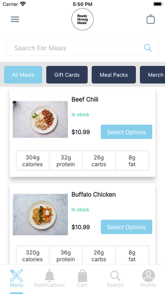 Ready Strong Meals är en mobilapp som underlättar för användare att beställa hälsosamma måltider direkt via sin iPhone. Med möjlighet att filtrera måltider efter kategori kan användarna enkelt navigera genom ett brett utbud av alternativ. Appen ger också detaljerad information om varje måltids näringsinnehåll, ingredienser, allergener och instruktioner för tillagning, vilket gör det enkelt att göra informerade val.